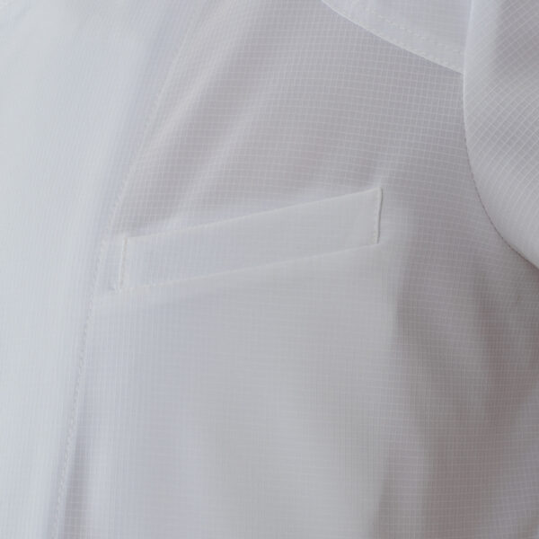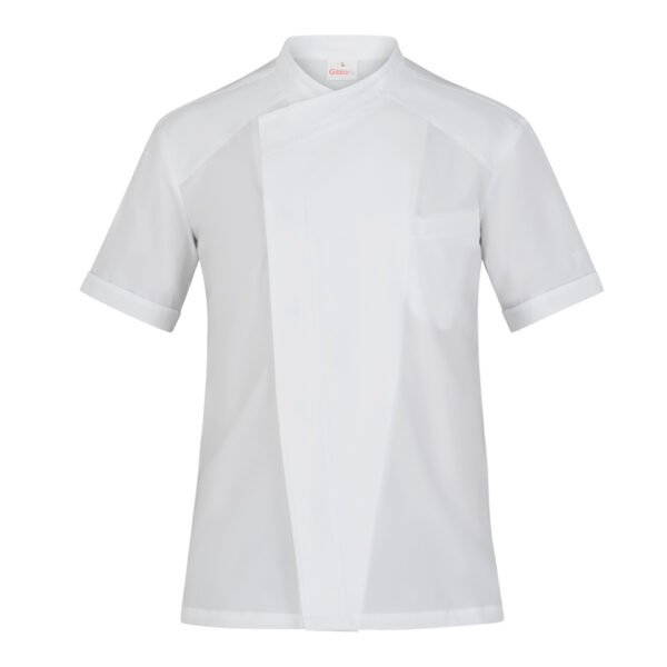 Bluza kucharska Aron ma krótki rękaw i typową koszulową plisę.