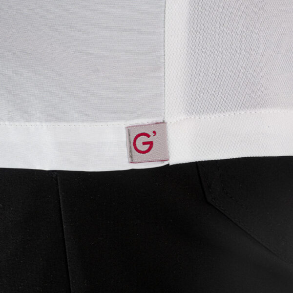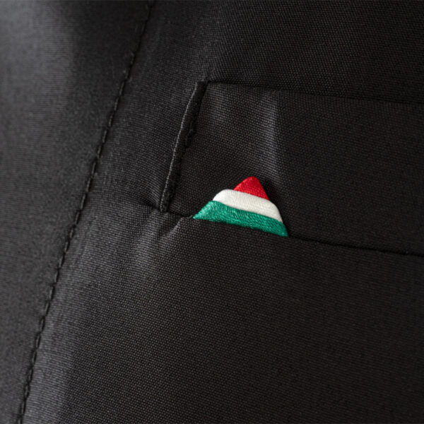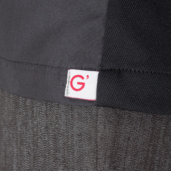 Brando przedstawia stójkę z kwadratową linią, ozdobioną kontrastowym profilem w kolorze ołowianej szarości, który pasuje do ukrytych guzików, tworząc kształt łzy na środku szyi. Dwa rozcięcia z tyłu zarysowują tylną część wykonaną z siateczki i zwiększają przewiewność odzieży.