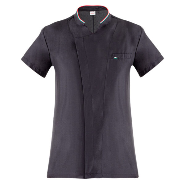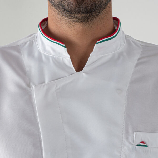 Krój szycia Slim Fit, ultra lekka i oddychająca tkanina, bluza kucharska zapinana na zatrzaski, kieszonka na lewej piersi, plecy bluzy wykonane z oddychającego materiału AirWeb