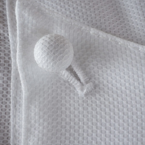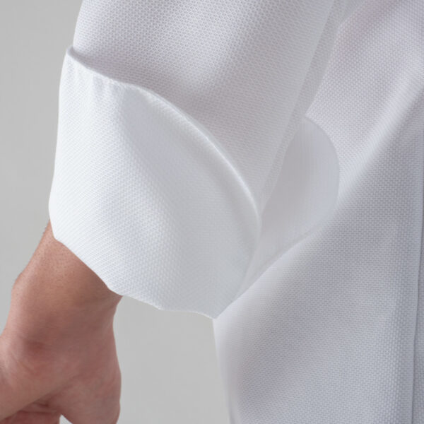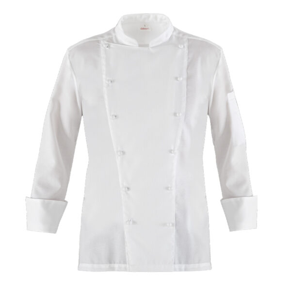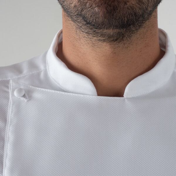 Bluza kucharska Dante to 100% Made in Italy. elegancki i wyrafinowany styl oraz zastosowany materiał, doskonała jakość wykonania, dbałość o każdy szczegół, ozdobny delikatny materiał ze 100% bawełny organicznej, nie wymaga prasowania. Tkanina charakteryzuje się splotem piquet, guziki robiono i przyszywano ręcznie, są pokryte materiałem z pętelkami w kształcie łezki.Krój szycia Slim Fit, zapięcie na guziki które są przyszyte, guziki są ręcznie robione i obszyte materiałem, kieszonka na długopis i zakreślacz na lewym rękawie, dwa rozcięcia z tyłu bluzy.