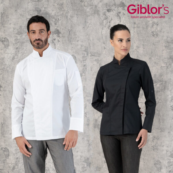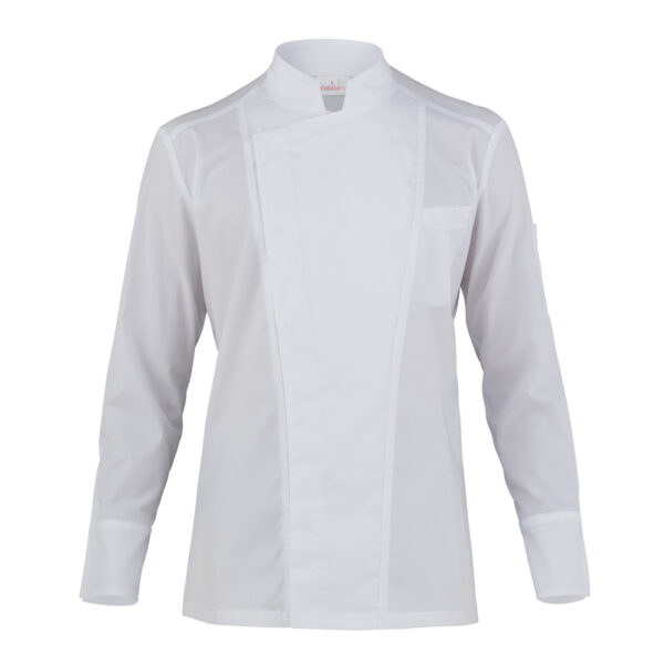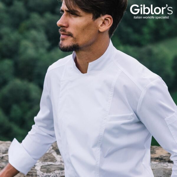 Darcy to bluza szefa kuchni, wynik wielkich poszukiwań stylistycznych w nowoczesnym kontekście. Ma kwadratową stójkę, która zawiera ośmiokątny wzór i dobrze komponuje się z ukrytym dwurzędowym zapięciem na sześć zatrzasków, podkreślonym dwoma rozcięciami obramowanymi podwójnymi szwami.