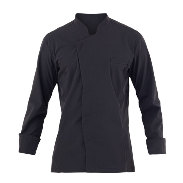 Bluza kucharska Giorgio posiada stójkę o zaokrąglonej linii, która świetnie komponuje się z ukrytymi guzikami.