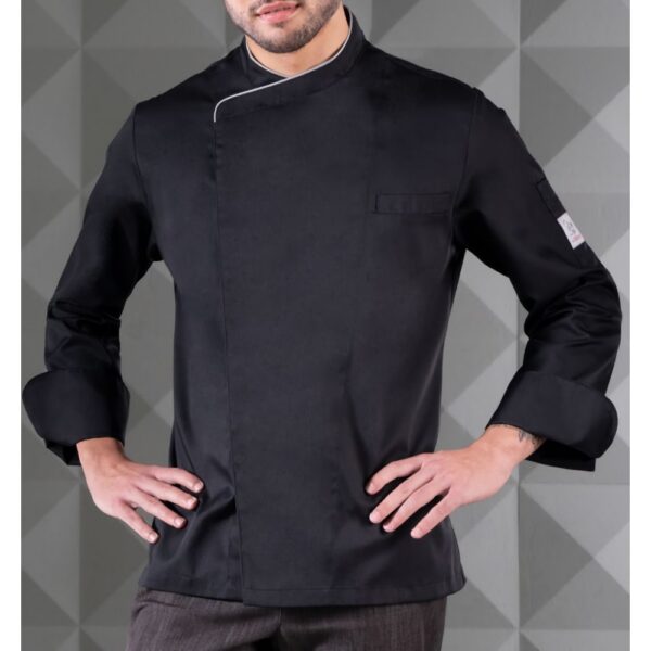Bluza kucharska Patrizio to klasyczne ubranie które zyskało nowoczesny wygląd dzięki dwóm wycięciom z tyłu bluzy. Kitel ma kołnierzyk typu francuskiego. Kołnierzyk jest wykończony klasyczną lamówką w kolorze perłowoszarym. Kobiecym wariantem jest bluza kucharska damska Susi.Krój szycia Slim Fit, bluza kucharska zapinana na ukryte zatrzaski, kieszonka na lewej piersi, kieszonka na lewym rękawie na długopis i zakreślacz, wstawki z dzianiny oddychającej AirWeb typu pique po bokach bluzy oraz na wewnętrznej stronie rękawów.