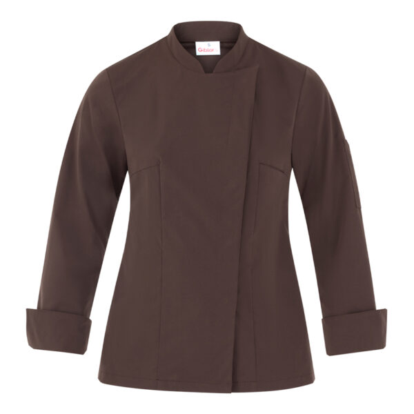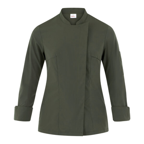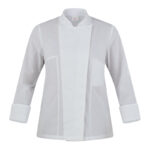 Bluza kucharska Gloria posiada stójkę o zaokrąglonej linii, która świetnie komponuje się z ukrytymi guzikami.