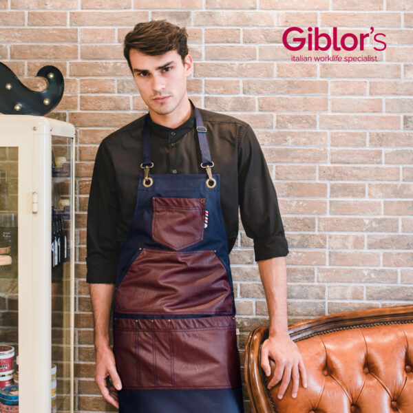 Fartuchy z funkcjonalnego i wszechstronnego materiału, wodoodpornego i olejoodpornego, łatwego w czyszczeniu, nadającego się do uzupełnienia stylu nowych salonów fryzjerskich inspirowanych latami pięćdziesiątymi. Fartuchy Picasso, Gauguin i Magritte mają odpinane regulowane szelki z karabińczykami, ćwiekami i skórzanymi kontrastami, kieszeń na piersi, dużą kieszeń środkową i podzieloną na przegródki kieszeń na różne narzędzia pracy. Każda komora jest starannie zakotwiczona nitami z postarzanego mosiądzu i nitowana 2-igłowymi ściegami.
