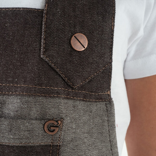 Fartuch Luna, kobieca wersja fartucha Brooklyn, wykonany jest z dżinsów z delikatnej bawełny o jednolitej fakturze, w odcieniach brązu, i ma na celu podkreślenie nowoczesnych i młodych środowisk, montowanych poprzez zabawę z tą samą tkaniną, przy użyciu obu części przednich a rewers przedstawia kieszeń na szelkach i dużą kieszeń boczną po prawej stronie, kontrastowo na jasnym tle. Fartuch Luna jest wykończony dwuigłowym przeszyciem, a wszystkie kieszenie są mocowane za pomocą prostych nitów, wśród których wyróżnia się litera „G” w postarzanej miedzi galwanicznej. Pasek na ramię jest mocowany do głowy za pomocą śruby, a druga strona jest regulowana. Fartuch Luna nadaje się do prania w wysokich temperaturach.