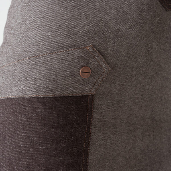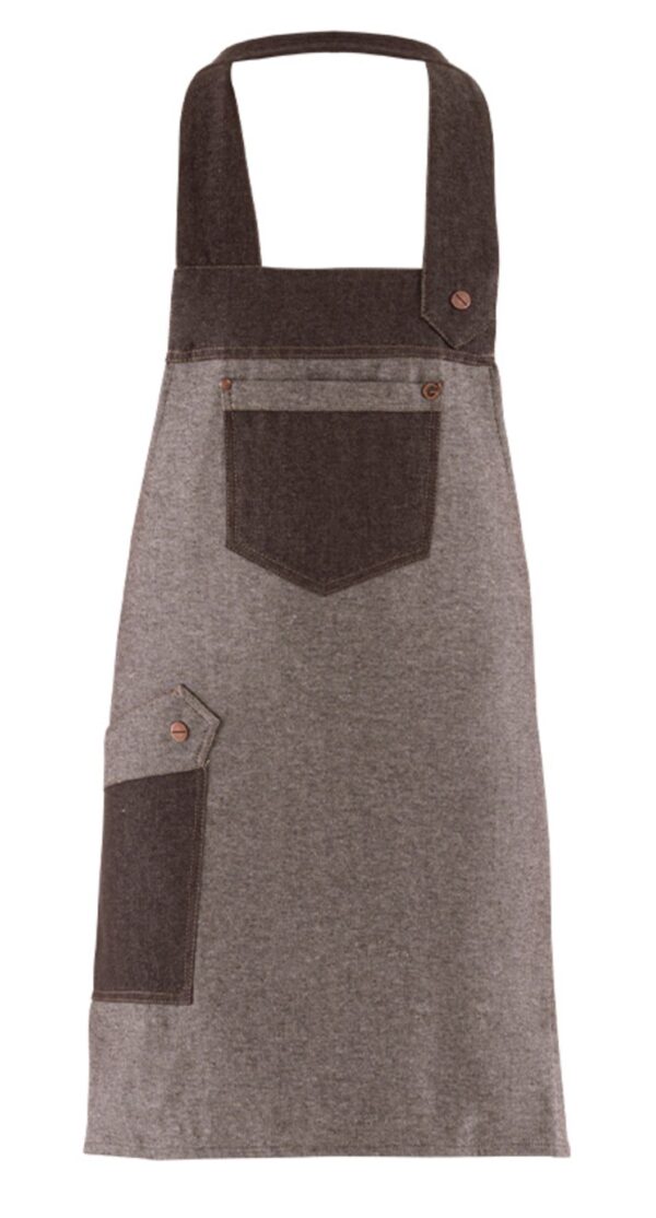 Fartuch Luna, kobieca wersja fartucha Brooklyn, wykonany jest z dżinsów z delikatnej bawełny o jednolitej fakturze, w odcieniach brązu, i ma na celu podkreślenie nowoczesnych i młodych środowisk, montowanych poprzez zabawę z tą samą tkaniną, przy użyciu obu części przednich a rewers przedstawia kieszeń na szelkach i dużą kieszeń boczną po prawej stronie, kontrastowo na jasnym tle. Fartuch Luna jest wykończony dwuigłowym przeszyciem, a wszystkie kieszenie są mocowane za pomocą prostych nitów, wśród których wyróżnia się litera „G” w postarzanej miedzi galwanicznej. Pasek na ramię jest mocowany do głowy za pomocą śruby, a druga strona jest regulowana. Fartuch Luna nadaje się do prania w wysokich temperaturach.