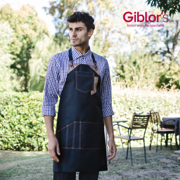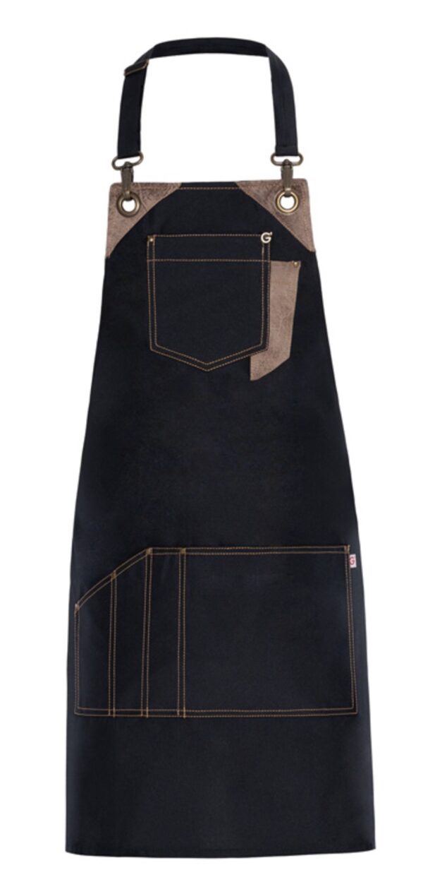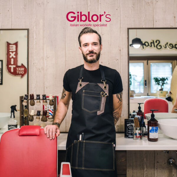 Fartuchy z funkcjonalnego i wszechstronnego materiału, wodoodpornego i olejoodpornego, łatwego w czyszczeniu, nadającego się do uzupełnienia stylu nowych salonów fryzjerskich inspirowanych latami pięćdziesiątymi. Fartuchy Picasso, Gauguin i Magritte mają odpinane regulowane szelki z karabińczykami, ćwiekami i skórzanymi kontrastami, kieszeń na piersi, dużą kieszeń środkową i podzieloną na przegródki kieszeń na różne narzędzia pracy. Każda komora jest starannie zakotwiczona nitami z postarzanego mosiądzu i nitowana 2-igłowymi ściegami.