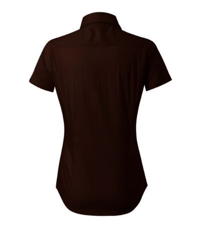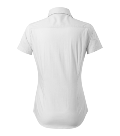 dopasowany krój z bocznymi szwami, podwójny karczek, zaszewki podkreślające damska figurę, kołnierzyk koszulowy, części przednie wykończone plisą, perłowe guziki w kolorze materiału (1 zapasowy), zaokrąglony dół