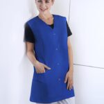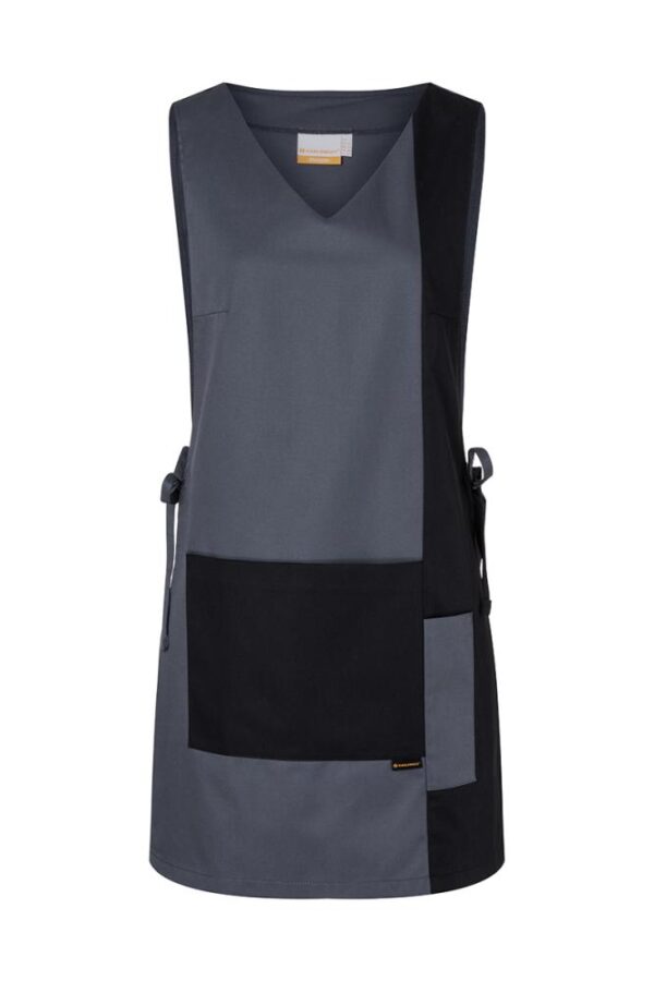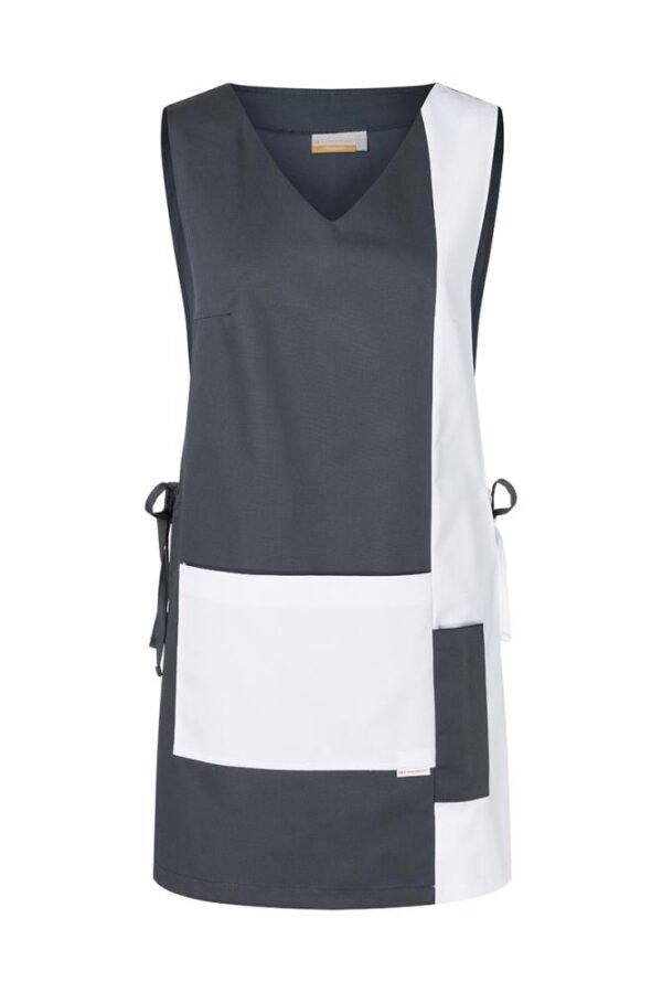 splot diagonalny, 215 g/m² – wysoka jakość, wstępnie wykurczona, trwały kolor, łatwa pielęgnacja – fartuch roboczy dla kobiet z zaszewkami na biust – 2 naszywane kieszenie z przodu – paski do wiązania bocznego – długość pleców dla rozmiaru I ok. 83 cm – nadaje się do prania przemysłowego