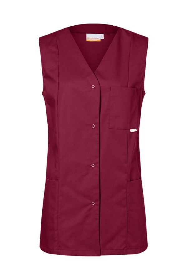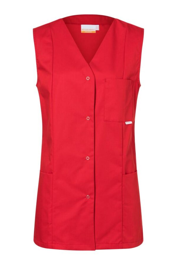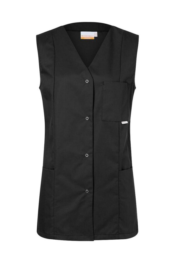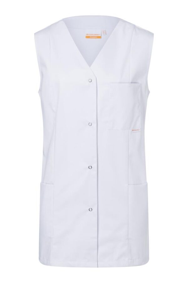 splot diagonalny, 215 g/m² – wysoka jakość, wstępnie wykurczona, trwały kolor, łatwa pielęgnacja – fartuch roboczy dla pań o luźnym i wygodnym kroju, angielskie szwy – dekolt w szpic, bez rękawów – 2 ukryte kieszenie boczne – 1 kieszeń na piersi po lewej stronie – 4 zatrzaski – długość pleców dla rozmiaru 38 ok. 79 cm – nadaje się do prania przemysłowego
