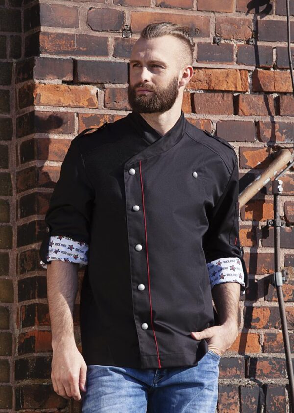 tkanina zewnętrzna: splot diagonalny, 210 g / m², 100% bawełna, wstępnie skurczona, trwale łatwa do prasowania dzięki obróbce Beau-Fixe®, trwała kolorystyka – podszewka: splot diagonalny, 140 g / m², 100% bawełna, wysoce uszlachetniona , wstępnie obkurczona, z nadrukiem – siatka z tyłu: 55 g / m², 100% poliester – nowoczesna bluza jednorzędowa z 5 guzikami i zatrzaskami w stylu ROCK CHEF® – optymalna wentylacja dzięki zakładkom z tyłu z siatką i oczkom sitowym w obszarze pod pachami – rękawy można podwinąć i przymocować za pomocą pasków, naramienniki – karczek z tyłu – kieszeń na rękawie wraz z kieszenią na długopis i naszywką z logo po lewej stronie – czerwone kontrastowe szwy, dekoracyjny guzik u dołu rąbka – nadrukowana podszewka na wewnętrznych rękawach i kołnierzu – Haft ROCK CHEF® na kołnierzu i jarzmie