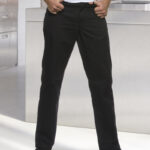 splot diagonalny, 200 g / m², białe prążki tkane – trwały kolor – spodnie męskie na regularny wzrost – pasek z materiału – 2 kieszenie boczne – 11 naszywanych kieszeni biodrowych po prawej stronie – szlufki na pasek – 2 zakładki z boku