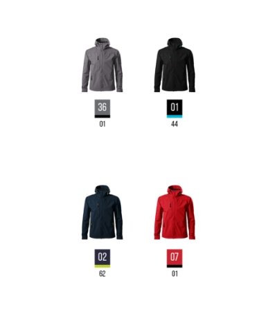 3-warstwowy softshell z membraną, efektowna tekstura softshell, wykończenie Nanotex® zapobiegające przenikaniu wody, spiralny zamek błyskawiczny z klapką na całej długości, kaptur ze ściągaczem, kaptur i rękawy regulowane na rzep, kieszenie z odwróconym spiralnym zamkiem błyskawicznym, kieszeń na piersi, lekko przedłużona w tylnej części, elementy kontrastowe, Informacje o pielęgnacji tkaniny softshell