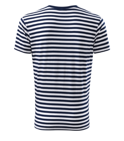 prążki w kombinacji kolorów biały i granatowy, krój ze szwami bocznymi, wąska lamówka z dzianiny ściągaczowej 1:1 z dodatkiem 5 % elastanu, lamówka na karku wzmocniona taśmą z materiału wierzchniego, szew wzmacniający na ramionach