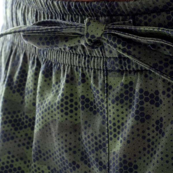 Posiada dwie kieszenie na biodrach, małą kieszeń z tyłu. Pas elastyczny i ściągany sznurkiem.