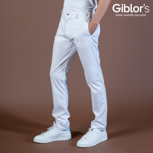 Spodnie Jackie unisex to nowa koncepcja odzieży: elegancka i o linii Slim Fit, wykonana z elastycznego TENCEL™ w nowej gramaturze 180 g/m2. co daje duży komfort. Wywodzące się ze spodni Darko, ale o smuklejszej linii, są eleganckim i poprzecznym elementem garderoby. Posiada dwie boczne kieszenie w szwach, dwie tylne kieszenie wzbogacone podwójnym szwem igłowym z posrebrzanym nitem pasującym do guzika na pasie. Ponadto gumka wszyta z tyłu paska dla większej swobody ruchu, 5 szlufek nadaje sportowy i młodzieńczy wygląd. Jest odporny na pranie w wysokich temperaturach i wybielanie. Jackie jest dostępny w czarno-białych wariantach kolorystycznych.