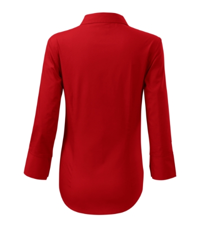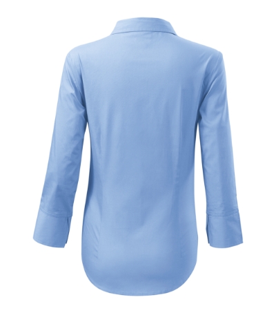 dopasowany krój z bocznymi szwami, zaszewki na plecach, zaszewki podkreślające damską figurę, kołnierzyk koszulowy, części przednie wykończone plisą, rękawy 3/4 z wysokim mankietem z rozcięciem, guziki w kolorze materiału (1 zapasowy), zaokrąglony dół